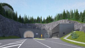 Visualisierung des künftigen Nordportalbereiches am Kramertunnel mit Blick auf das Vorfeld. Rechts im Bild das Betriebsgebäude Nord, mittig der Haupttunnel und der Rettungsstollen in der Portalwand, im Hintergrund der ehemalige Steinbruch.