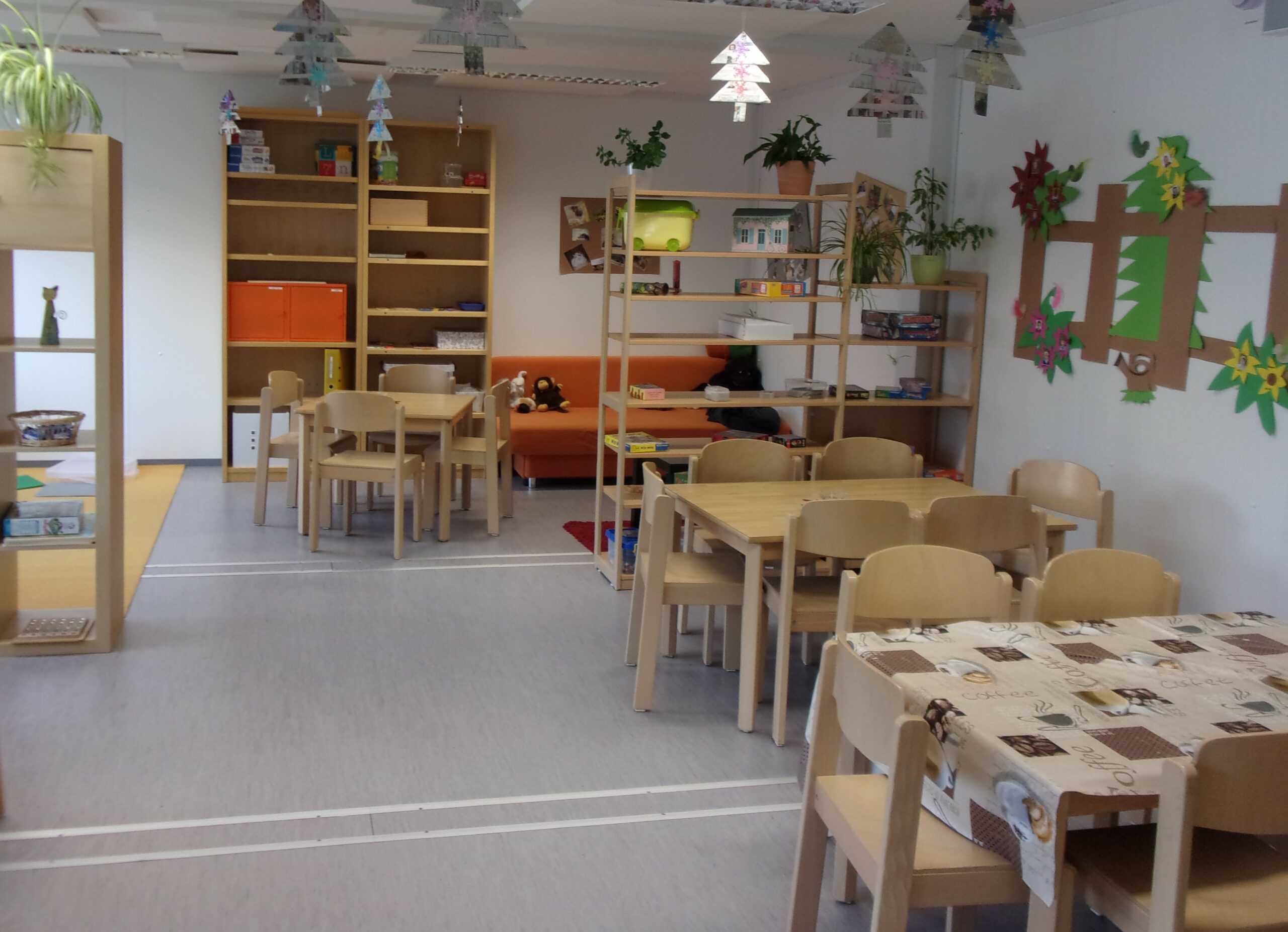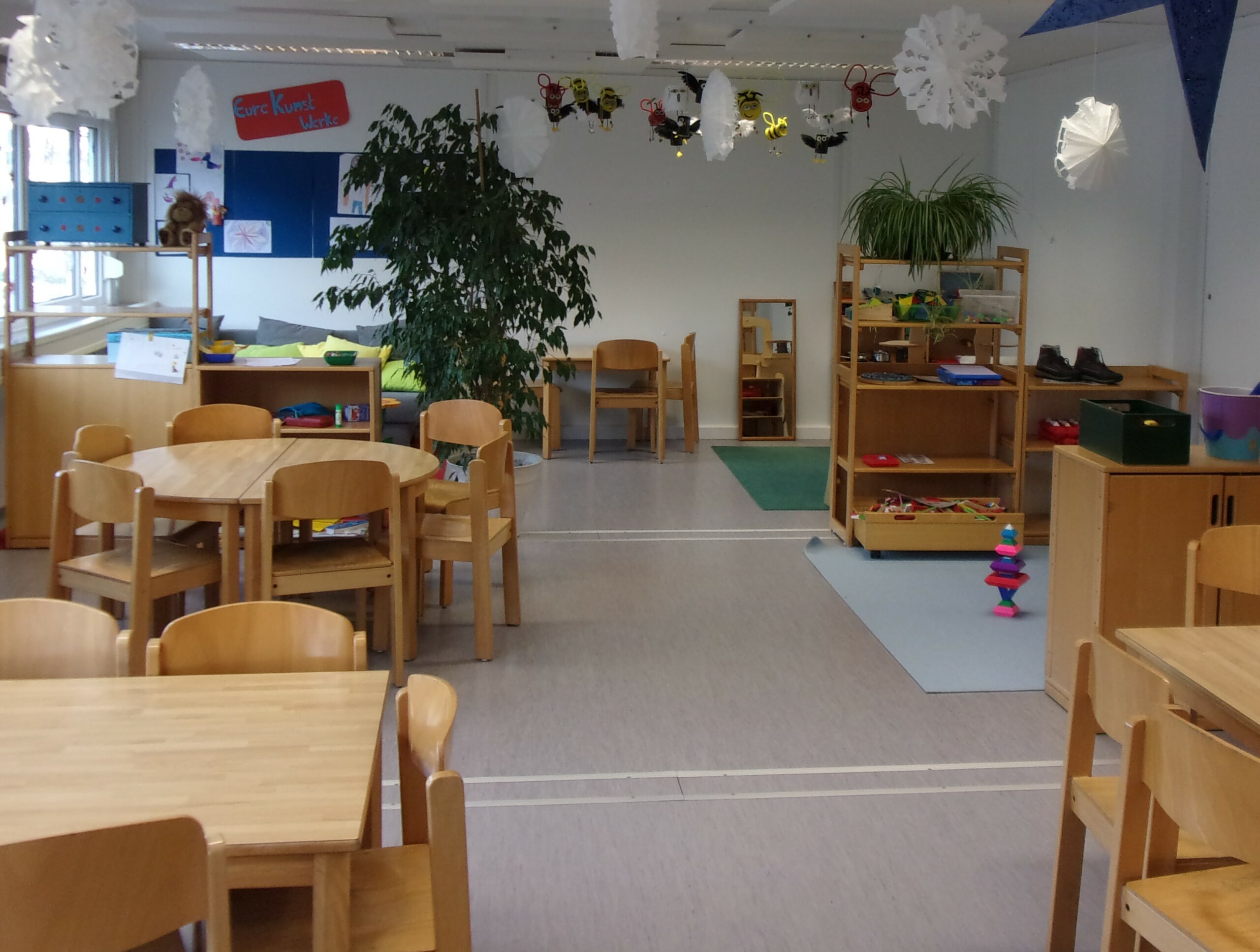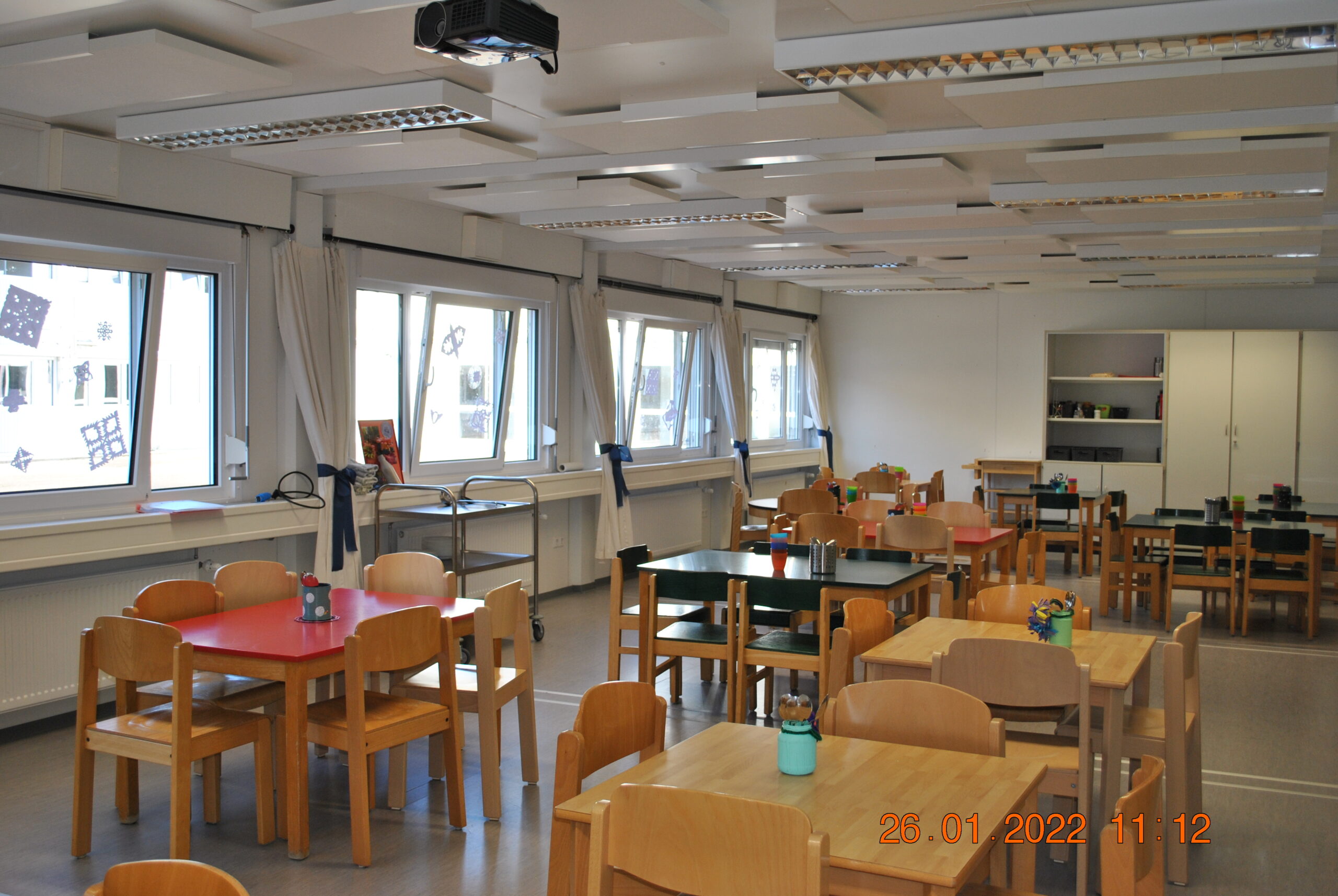Drei Gruppen- und Hausaufgabenräume auf einer Etage, Küche, Ausweichraum, Bewegungsraum, Personalraum, Büro, sowie einen zentralen Raum zum Mittagessen.