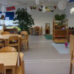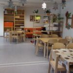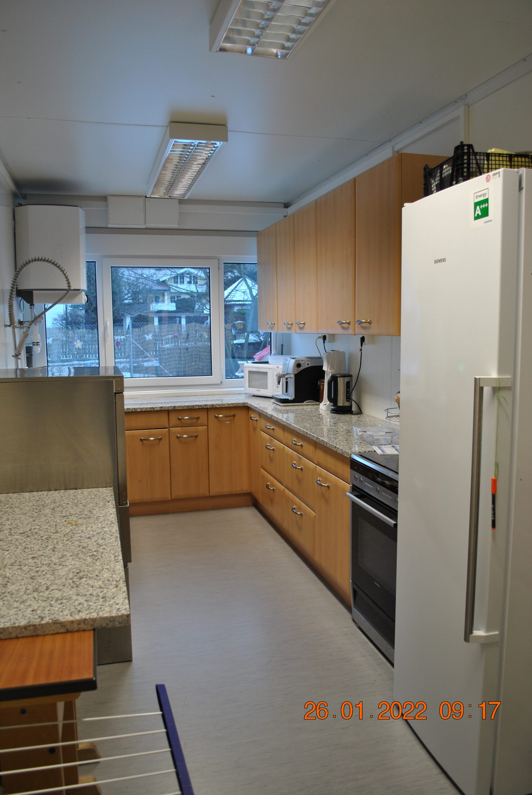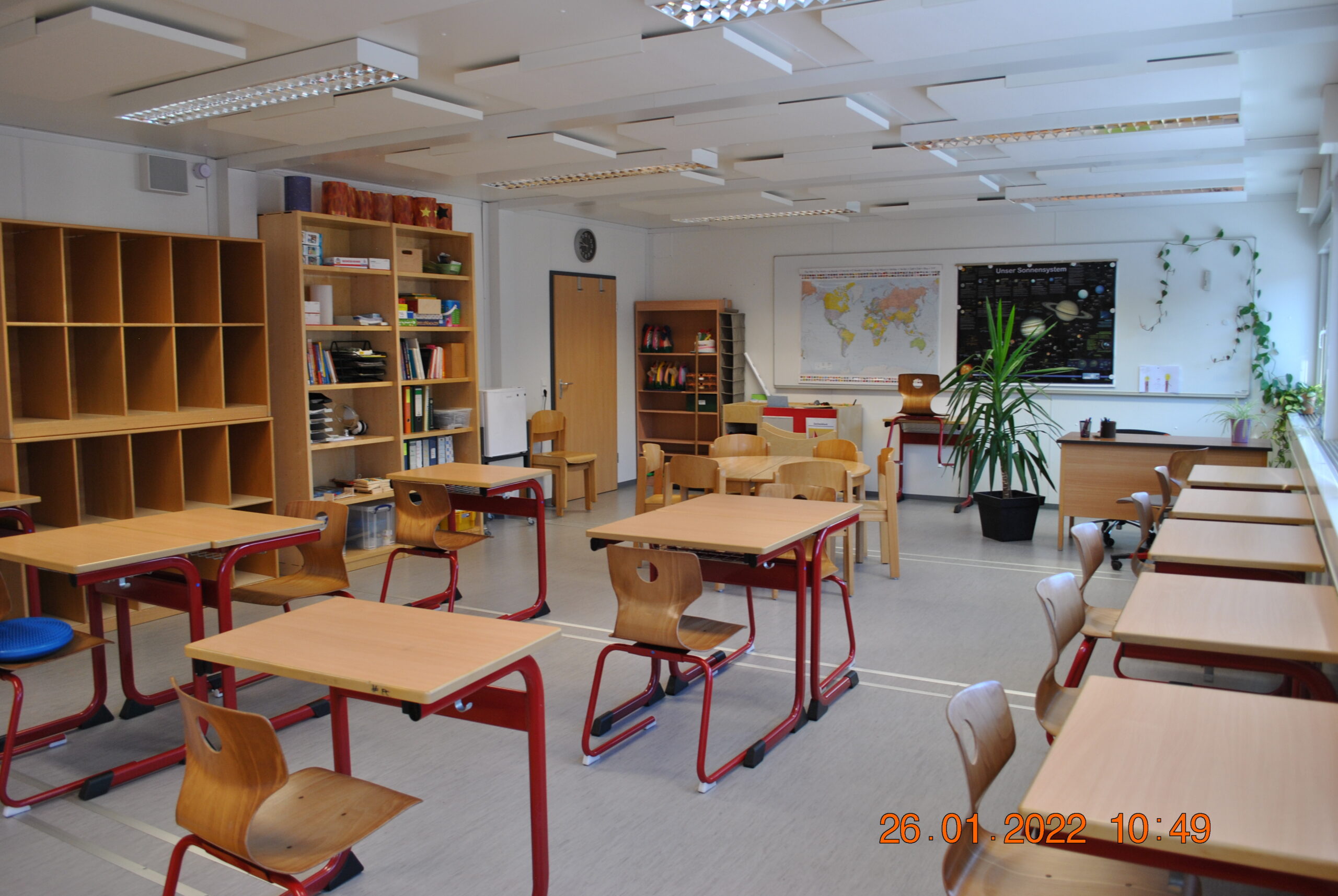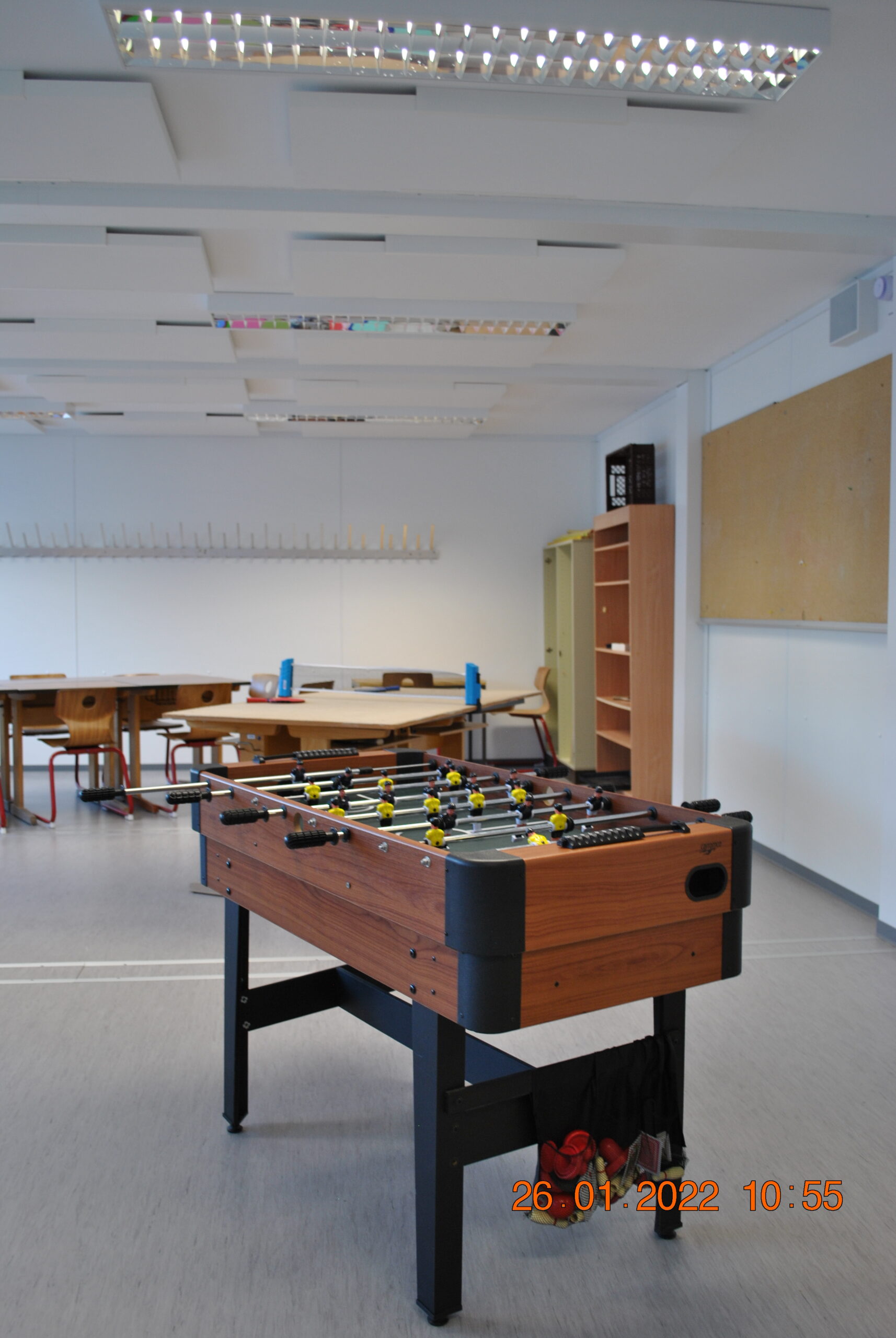 Drei Gruppen- und Hausaufgabenräume auf einer Etage, Küche, Ausweichraum, Bewegungsraum, Personalraum, Büro, sowie einen zentralen Raum zum Mittagessen.
