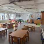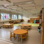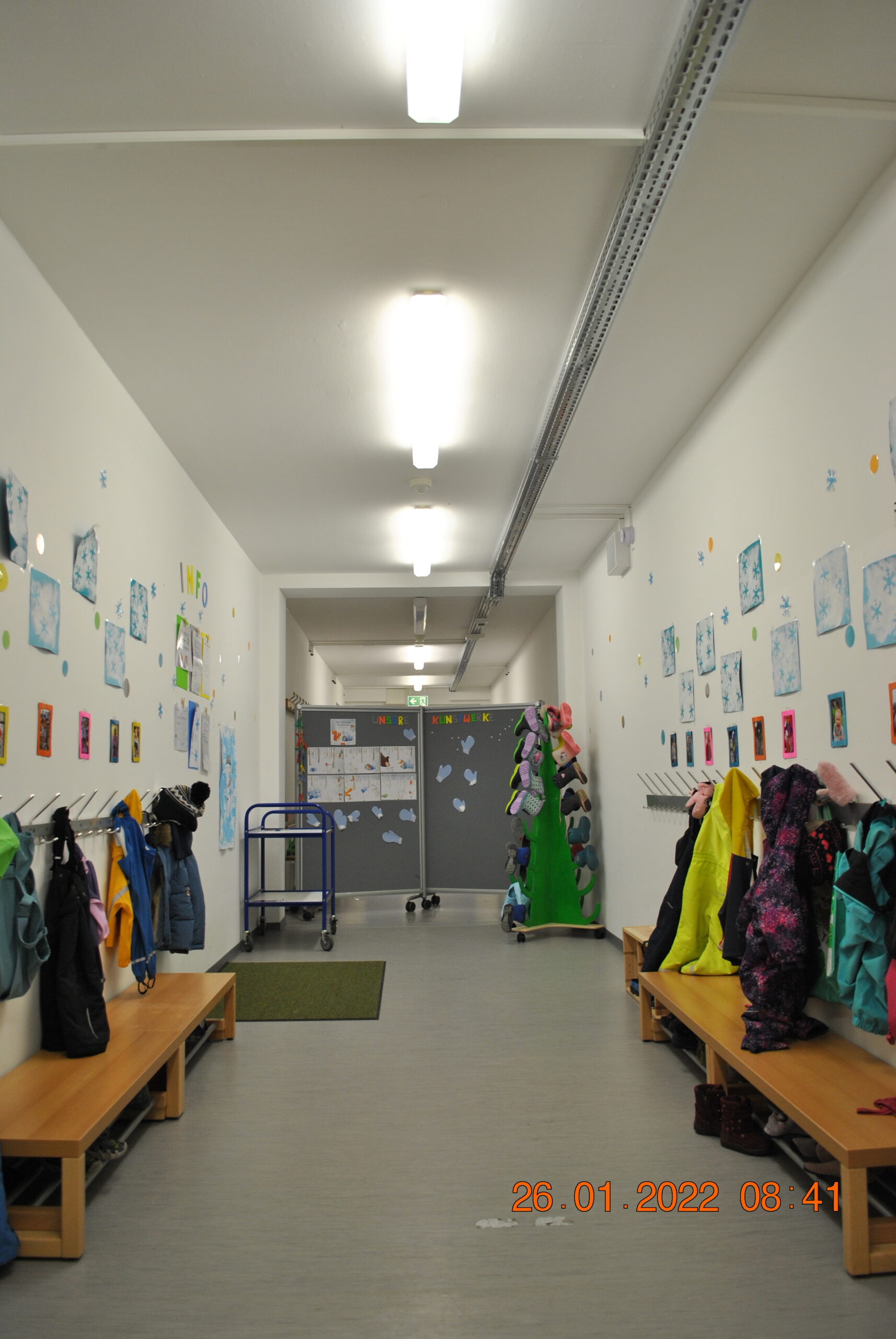 Im Krippenbereich befinden sich außerdem zwei Waschräume mit Toiletten und Waschbecken, die auf die Bedürfnisse der Kinder angepasst sind, das Büro, die Küche und ein Personalraum, der auch für Elterngespräche genutzt wird.