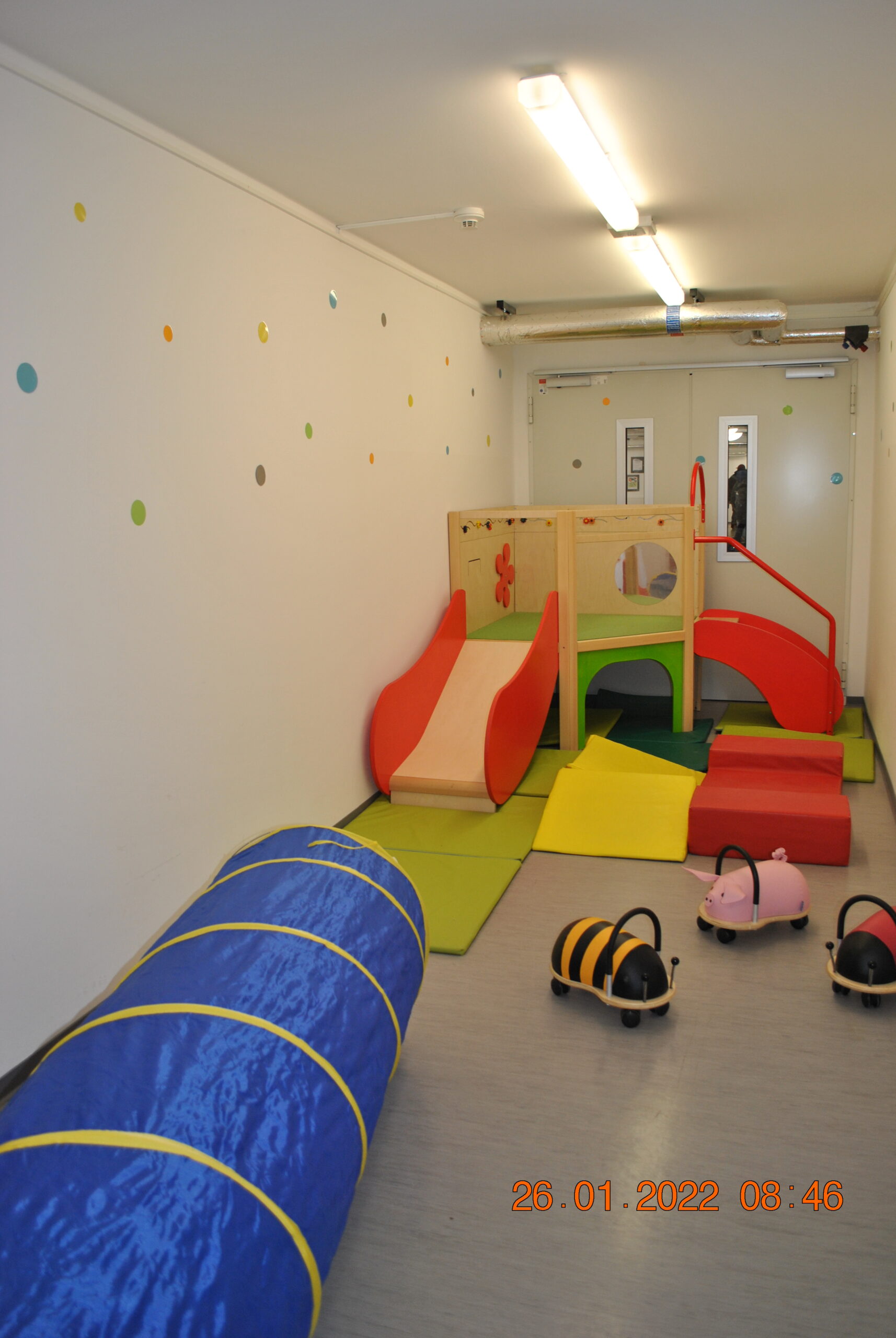 Unsere Einrichtung befindet sich derzeit, übergangsweise, in einem Containerbau. Im Erbgeschoss finden vier Krippengruppen ihren Platz, sowie sanitäre Anlagen, das Büro und der Elternbereich. Der Flur dient bei schlechten Wetter, ausgestattet mit einer Rutsche und vielen Bobbycars, als Ort zum Toben und Rennen.