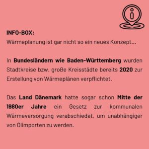 Wichtig zu beachten ist, dass eine Wärmeplanung dabei ein informelles Planungsinstrument, also nicht rechtsverbindlich, ist. Sie kann als Plan an sich keine Ausbaugarantien für Wärmenetzgebiete, sowie Anschluss- oder Termingarantien geben. Dies kann nur durch die konkrete Umsetzung von Maßnahmen passieren.